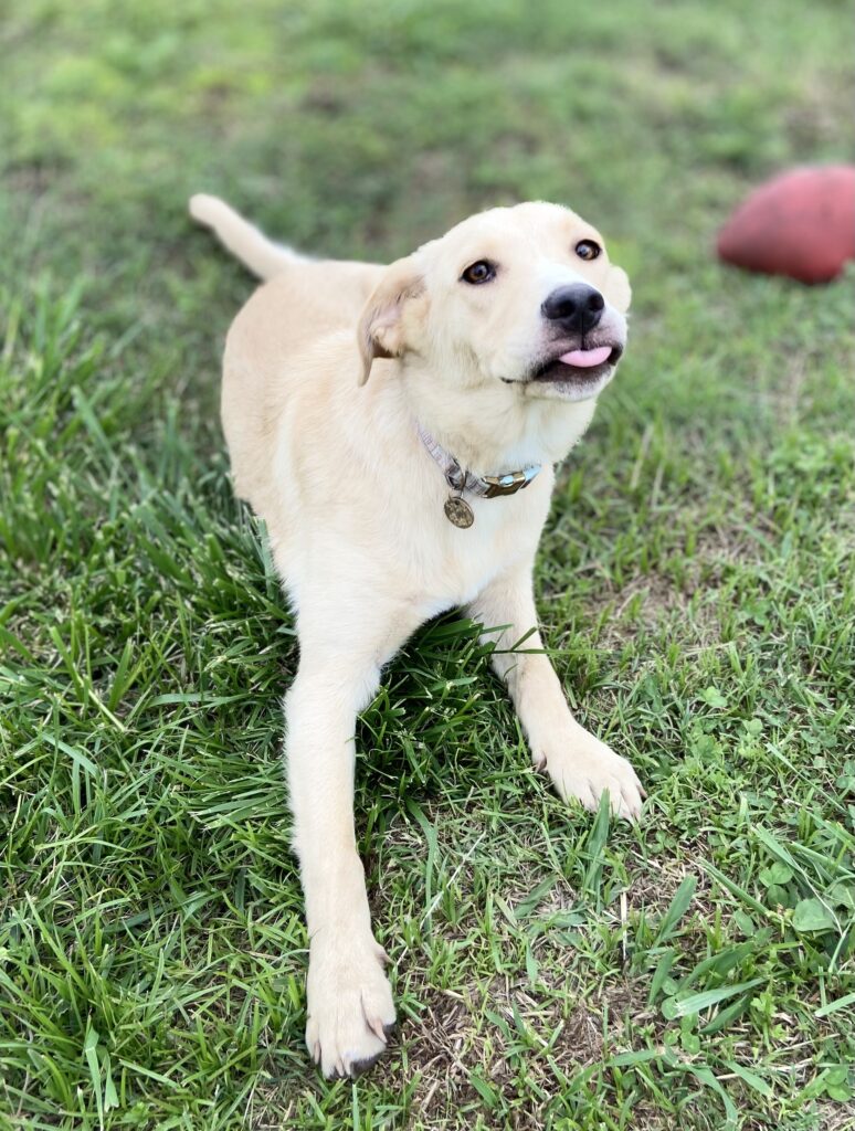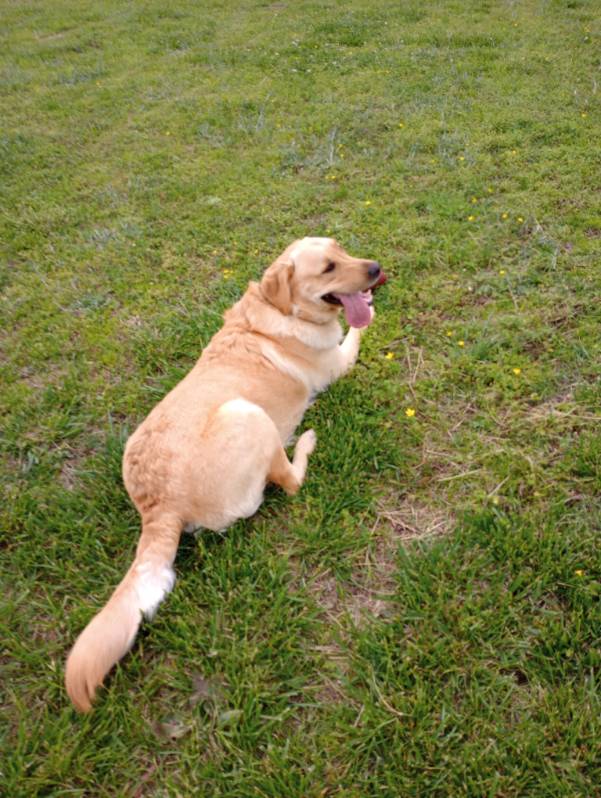 My best friend had a beautiful Golden retriever named Comet, who had been attacked by coyotes and passed away. What no one knew at the time was that Comet had gotten their neighbors Golden Labrador pregnant. There were 8 puppies in the litter and I picked out my Gideon. He started going to work with me everyday because at the time I was in an office and there was no one at home all day everyday to take care of him. He became my velcro dog! He really doesn't like it if he and I are more than 4 feet apart. He is the most inclusive dog I have ever come across. When a new dog is brought to our house he is the welcoming committee and helps them ease into the pack. He plays gently with puppies and runs around the yard playing with all of the dogs. He will get a toy and run off to get the other dogs to chase him, he is also kind of the babysitter if the bunch.