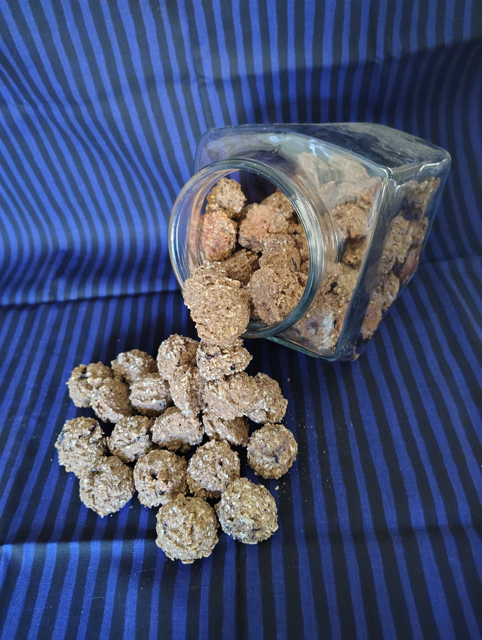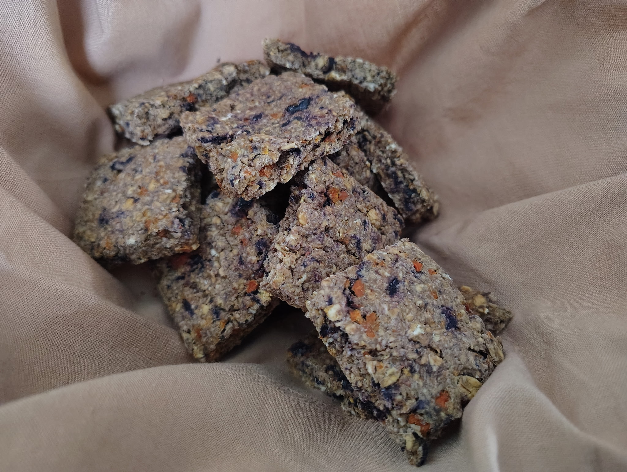 Rolled oats, carrot, blueberries, egg, oat flour, natural peanut butter, flaxseed